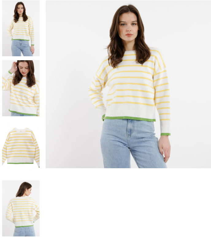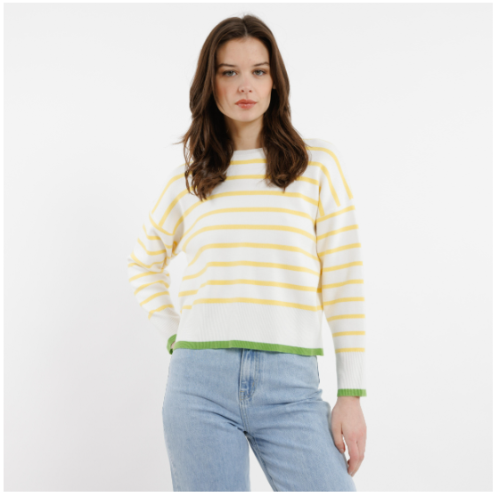 Printemps (Spring). Pull. Col rond Manches longues Rayures. Top round neck, long sleeves. Composition: 20% polyamide. 38% polyester. 42% viscose. Size: S, S/M, M/L.